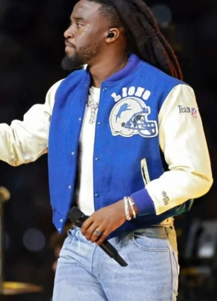 Celebrate the gridiron and the stage at the Bears-Lions Thanksgiving Day Game Halftime Show out in support of Shaboozey Detroit Lions Varsity Jacket which is a take on sports heritage and fashion. Made from warm wool with durable leather sleeves this jacket is what in terms of performance and durability. The soft viscose lining which is against the skin is as smooth as it is soft, and the ribbed collar, cuffs and hem which hug in at the neck and wrists bring that athletic fit. With a button front and long sleeves it is a true to form classic varsity piece. In a bold blue and white the jacket doles out Detroit Lions spirit in full force and at the same time brings a modern edge to any outfit. It also has two outside and two inside pockets which does not sacrifice style for function. A great choice for Shaboozey fans, NFL aficionados and those into timeless streetwear.
